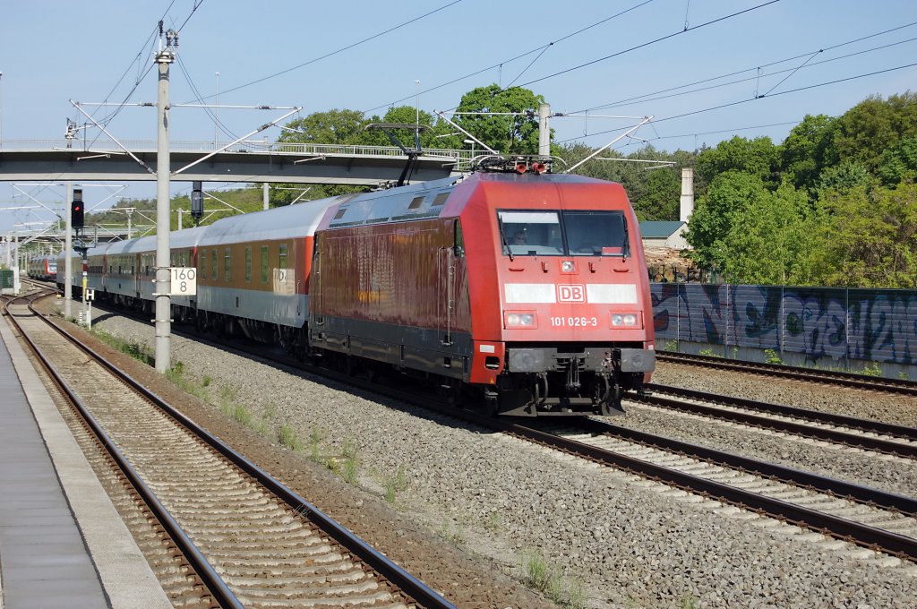 101 104-8 mit einem IC nach Schiphol (Airport) zwischen Nennhausen und Rathenow. 16.04.2010
