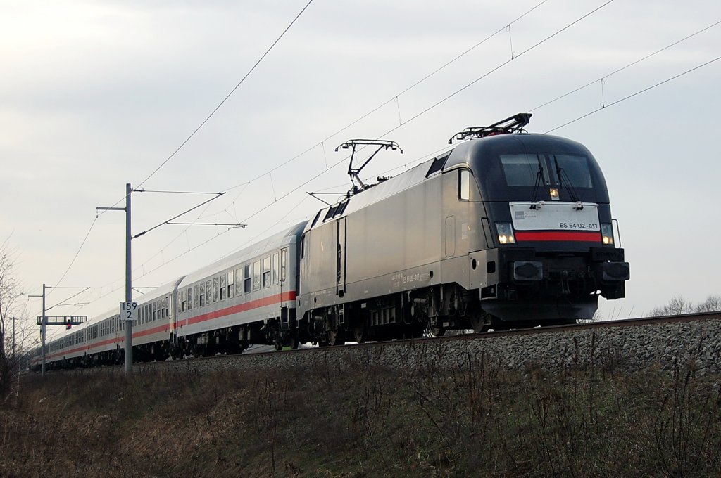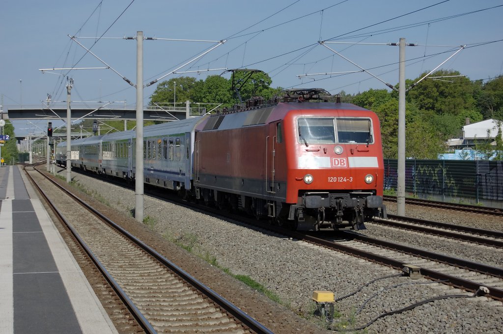 120 124-3 mit dem EC 341 von Hamburg-Altona nach Krakow Glowny in Nennhausen. Zwei PKP-Intercity und vier IC-Waggons. 29.05.2010