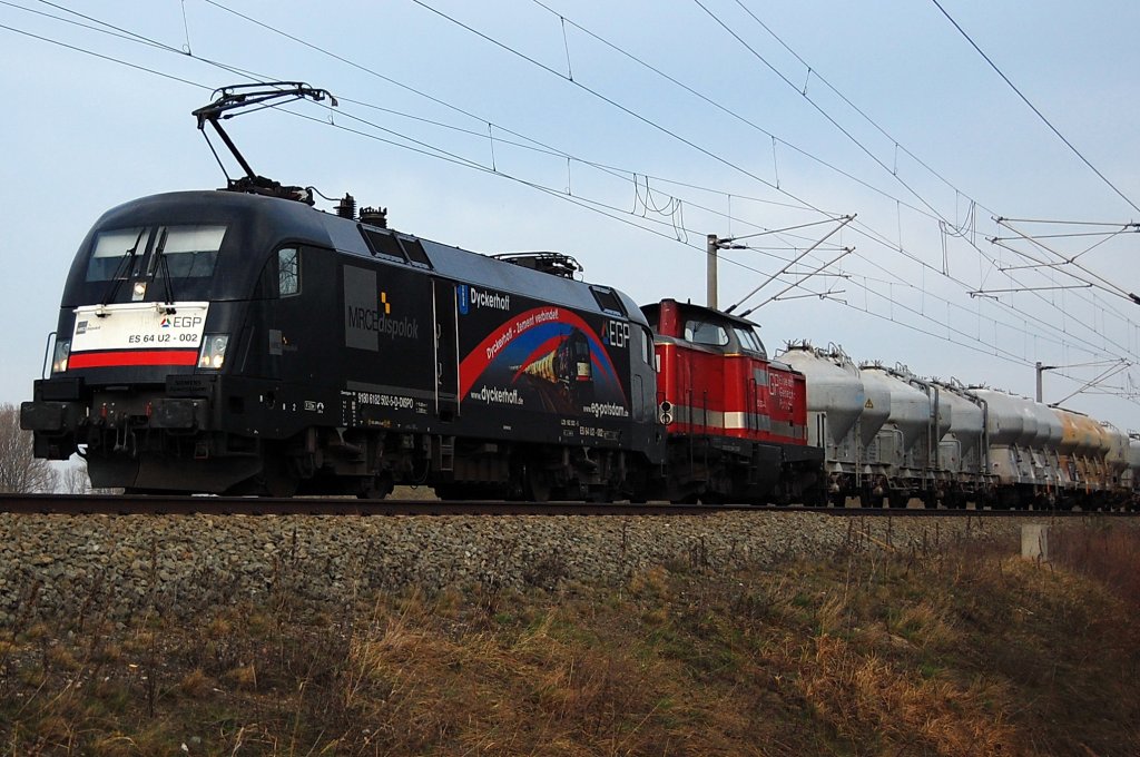 ES 64 U2 - 002 (182 502-5) der EGP mit einem Zementzug. Als Wagenlok war die 212 024-4 der EGP. Zwischen Buschow und Nennhausen. 26.03.2010