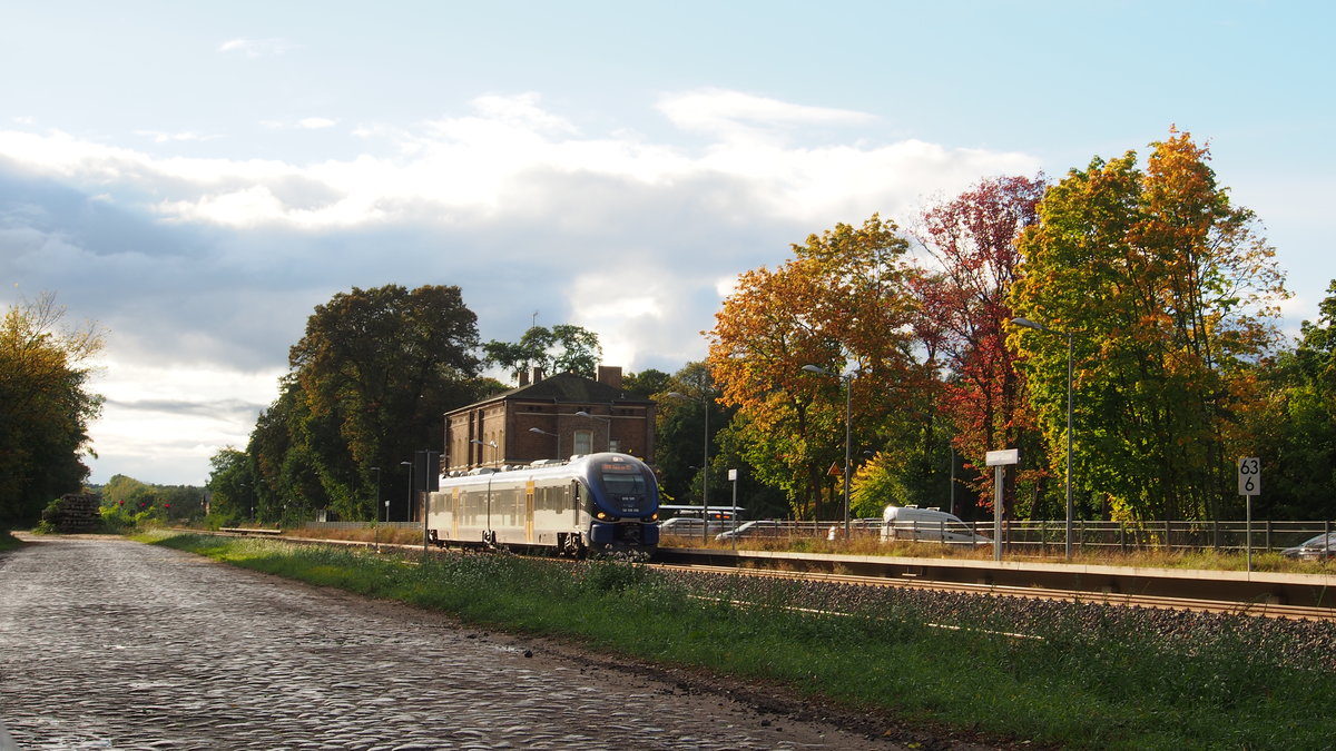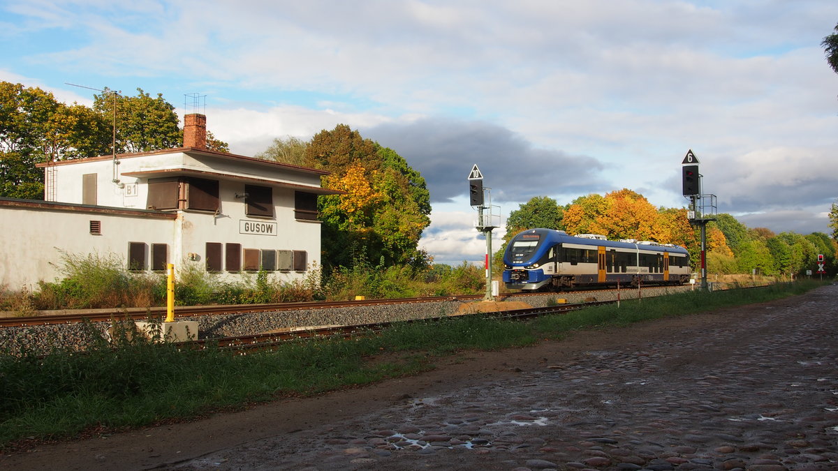 Alt & neu: 632 021 (neuer PESA Link) fährt am 09. Oktober 2016 als RB 5171 aus Seelow-Gusow weiter, seinem Ziel Kostrzyn entgegen. Dabei passiert wird das alte Bahnhofsgebäude.