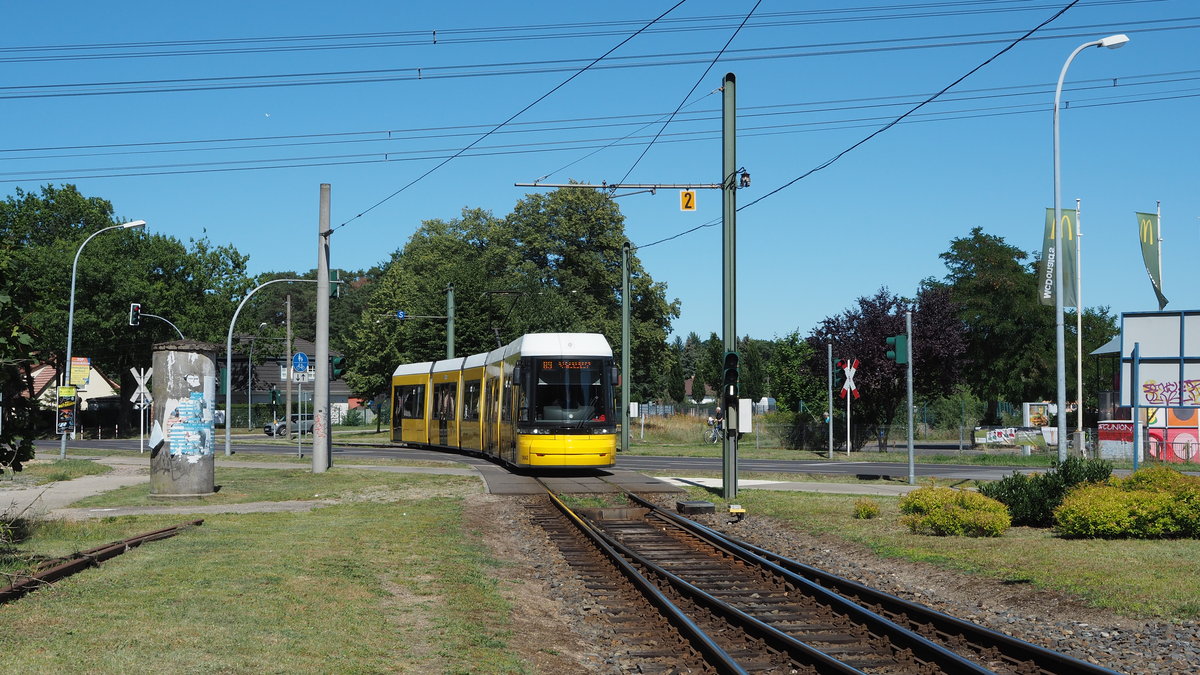 Wagen 0042 (einer der beiden modernen "Flexity") bestritt am Samstag, den 1. August 2020, den Wochenendverkehr auf der Strausberger Tram-Linie. Naja, eigentlich Strausberger Eisenbahn. Hier in der Kurve beim Überqueren der "Ernst-Thälmann-Str." kurz vor der nächsten Station "Hegermühle". Ziel ist der Bahnhof "Strausberg". Strausberg, der 1. August 2020