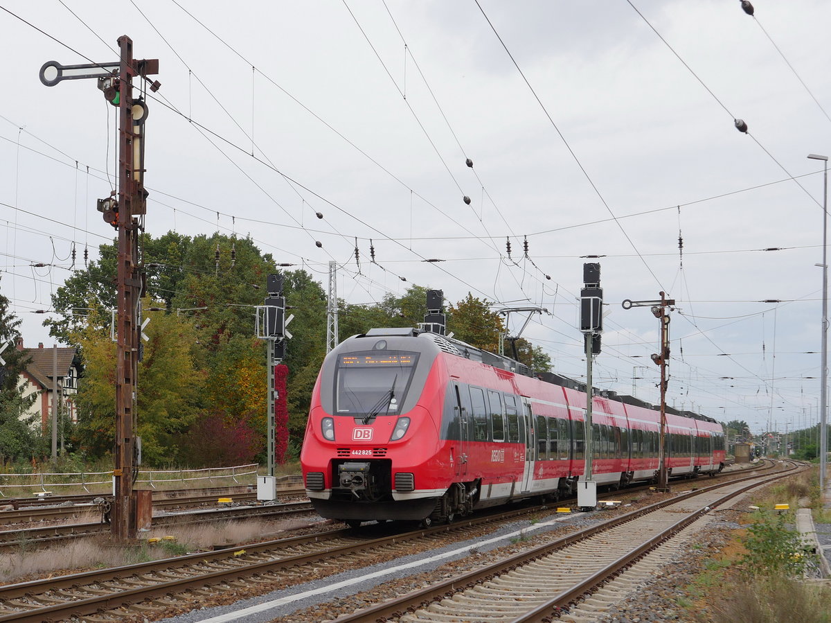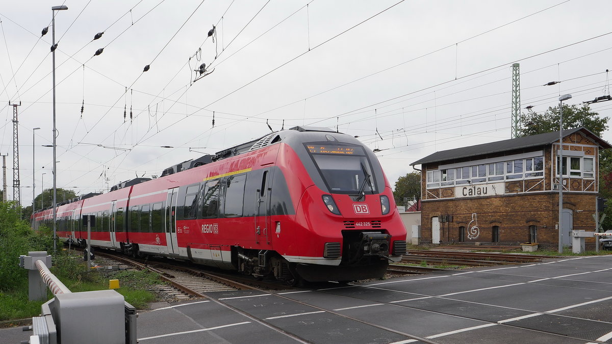 Hamster 442 325 / 825 als RE 10 (18389) Leipzig - Cottbus bei Einfahrt in Calau (Nl); Die Tage der Formsignale scheinen gezählt zu sein denn die neuen Lichtsignale stehen bereits, sind aber mit Kreuz als ungültig gekennzeichnet; 10.10.2020