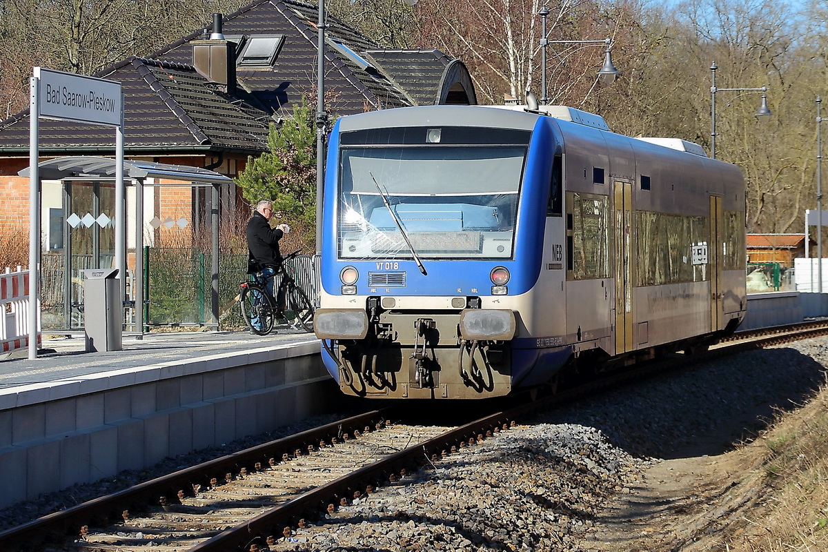 Niederbarnimer Eisenbahn VT 018 (95 80 0650 550-6 D-NEBB) am 08. März 2022 in dem im Dezember 2021 neu eröffneten (End)Haltepunkt Bad Saarow-Pieskow. Klaus-P. Dietrich