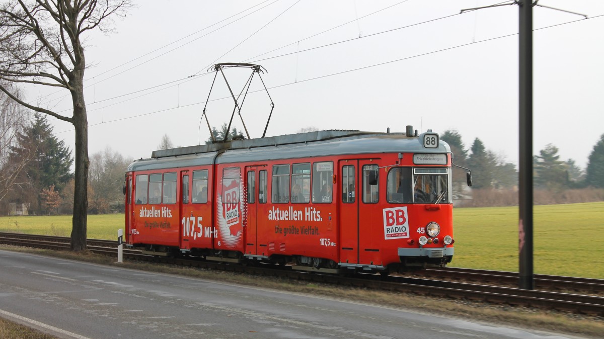 Tw 45 der Schöneicher-Rüdersdorfer-Straßenbahn mit BB-Radio-Werbung.