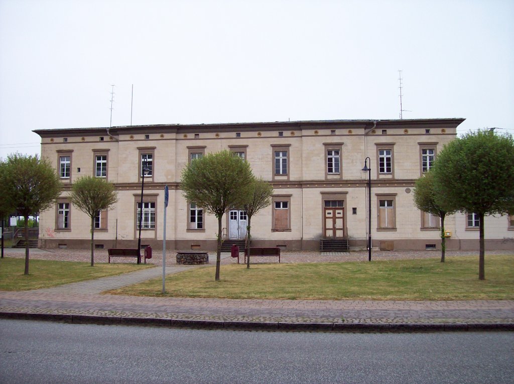 Neustadt/Dosse, klassizistisches Bahnhofsgebäude (leer stehend), Straßenseite (05.05.2009)