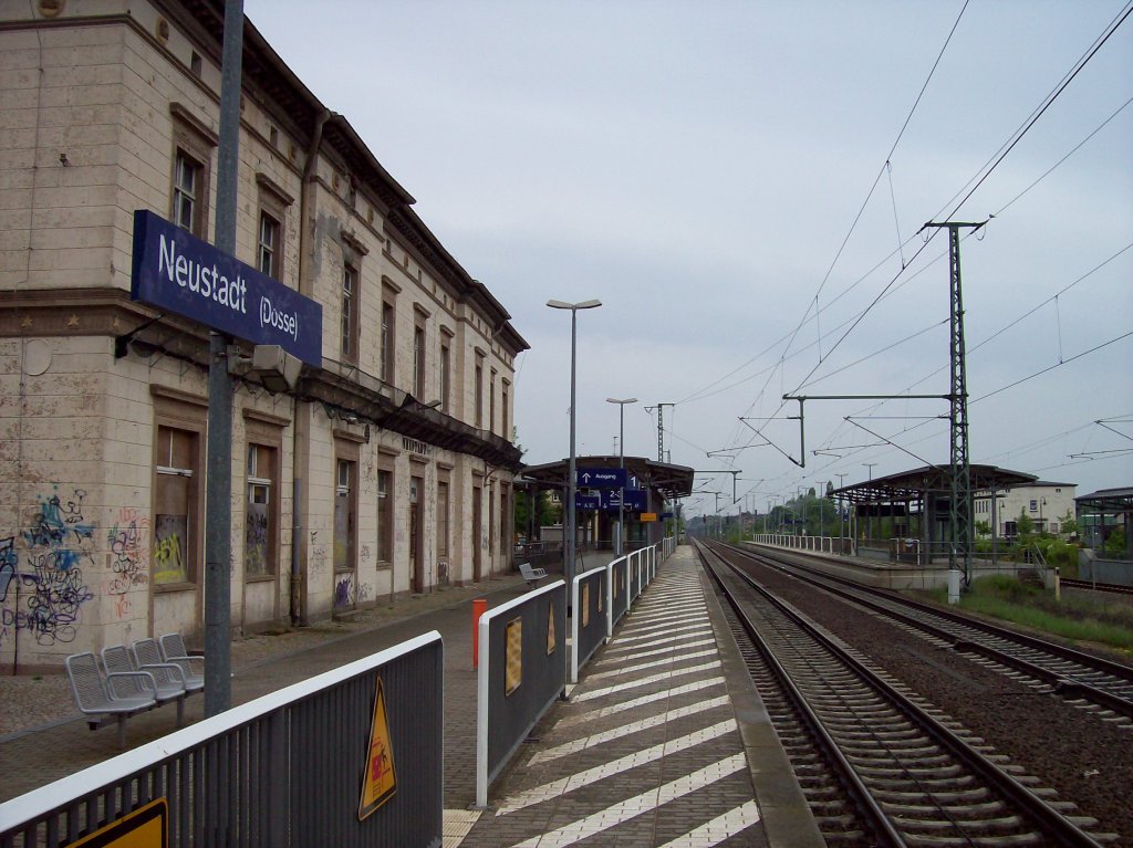 Neustadt (Dosse) (Hamburger Bahn, KBS 202) und 209.73, Bahnsteige und leer stehendes Empfangsgebäude (05.05.2009)