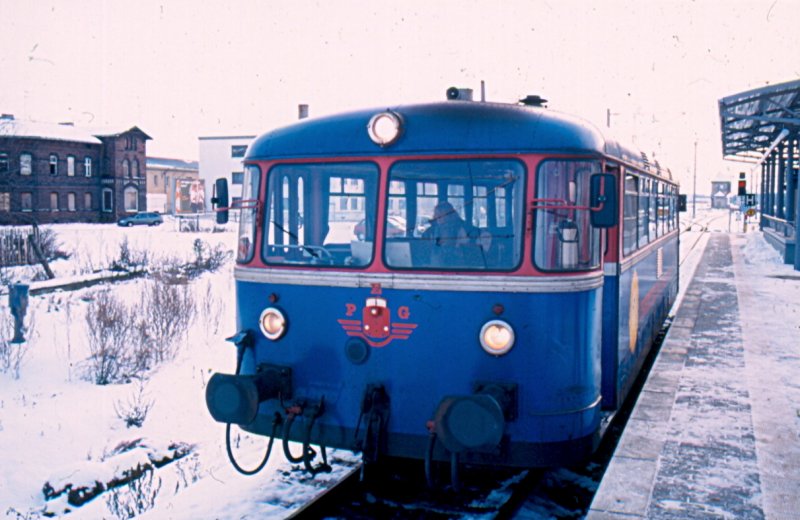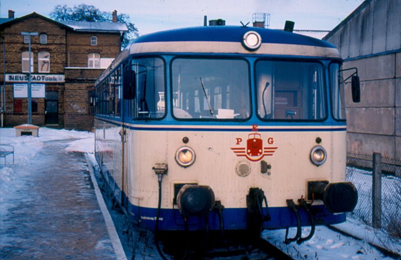 Winter 2002, Neustadt/Dosse. Dieser Uerdinger der PEG wurde mit Rapsöl betrieben. Seinerzeit sehr innovativ für ein so altes, aber zeitlos schönes Gefährt. Abfahrbereit in Richtung Rathenow. Hinweis: eingescanntes Dia