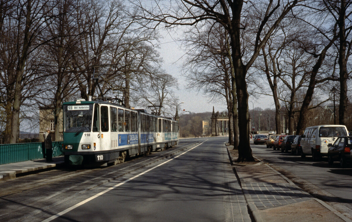 Postdam VIP SL 93 (KT4D 110) Berliner Straße / Glienicker Brücke (Endstelle, Abfahrtshaltestelle) am 28. März 1994. - Scan eines Diapositivs. Film: AGFA Agfachrome 200 RS. Kamera: Leica CL.