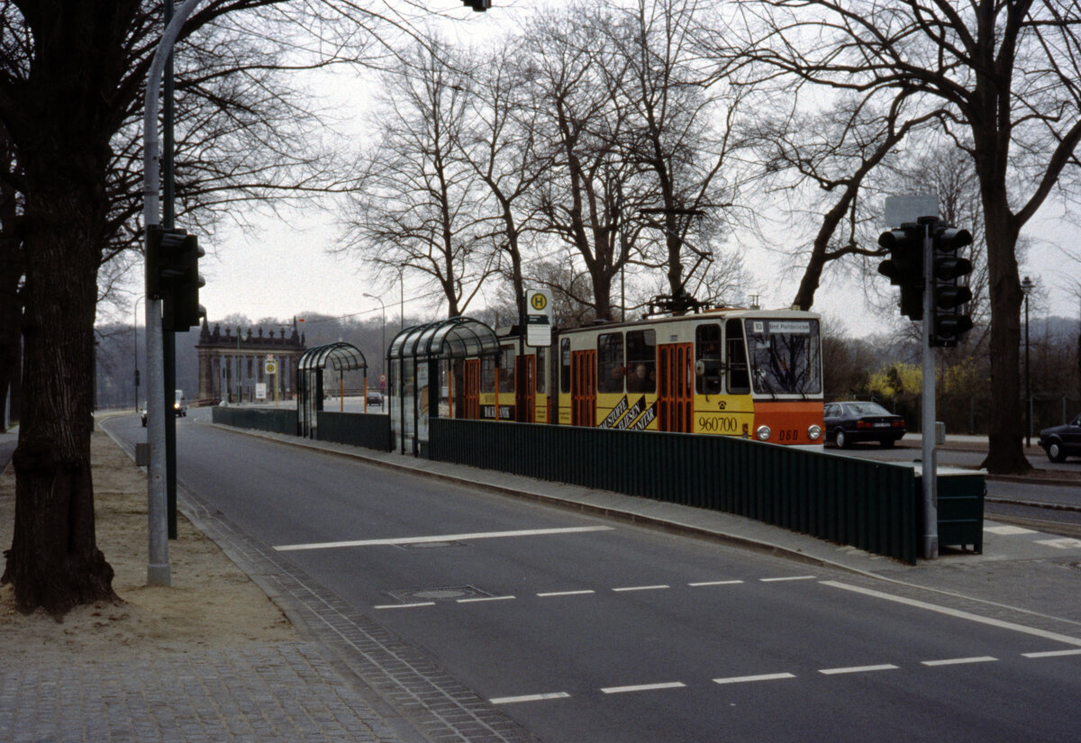 Potsdam VIP SL 93 (KT4D 060) Berliner Straße / Glienicker Brücke (Endstelle, Abfahrtshaltestelle) im April 1993. - Scan eines Diapositivs. Film: AGFA Agfachrome 200 RS. Kamera: Leica CL.
