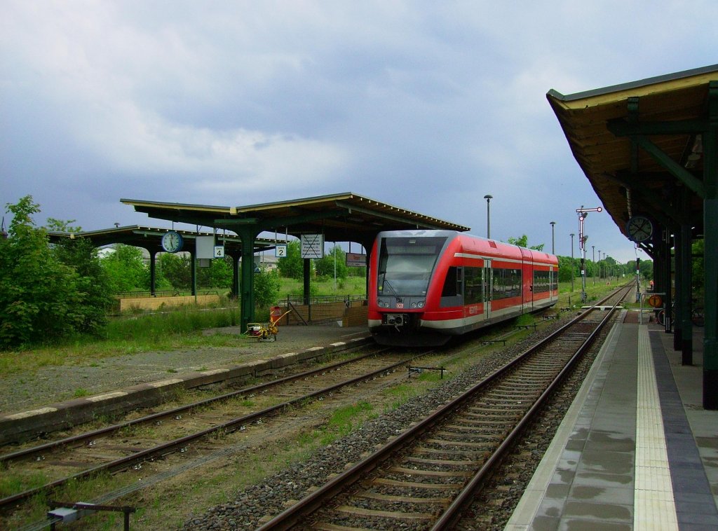 Am 29.05.2013 kam es zur seltenen Situation, dass sich mehrere Fahrzeuge im Bahnhof Templin befinden. So traf RB 92425 nach Zehdenick (Mark) auf Reservetriebwagen 646 014.