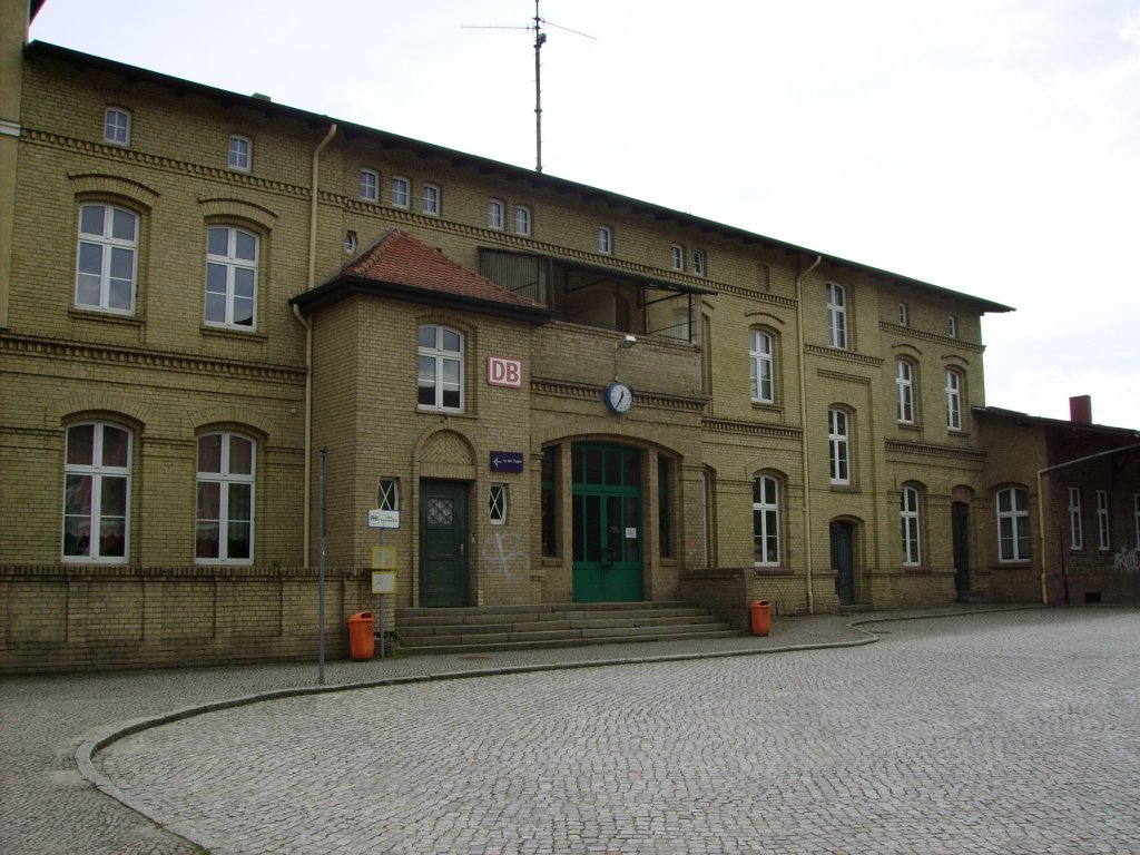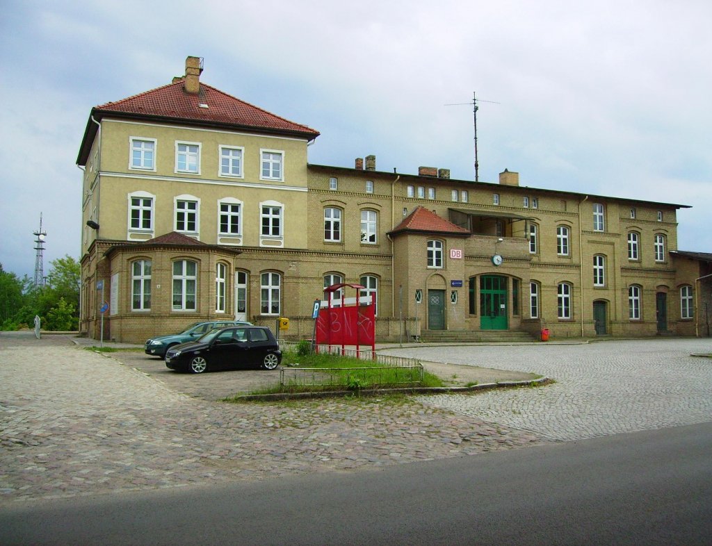 Das leider geschlossene, aber gut erhaltene Empfangsgebäude des Bahnhofs Templin, am 04.07.2009.