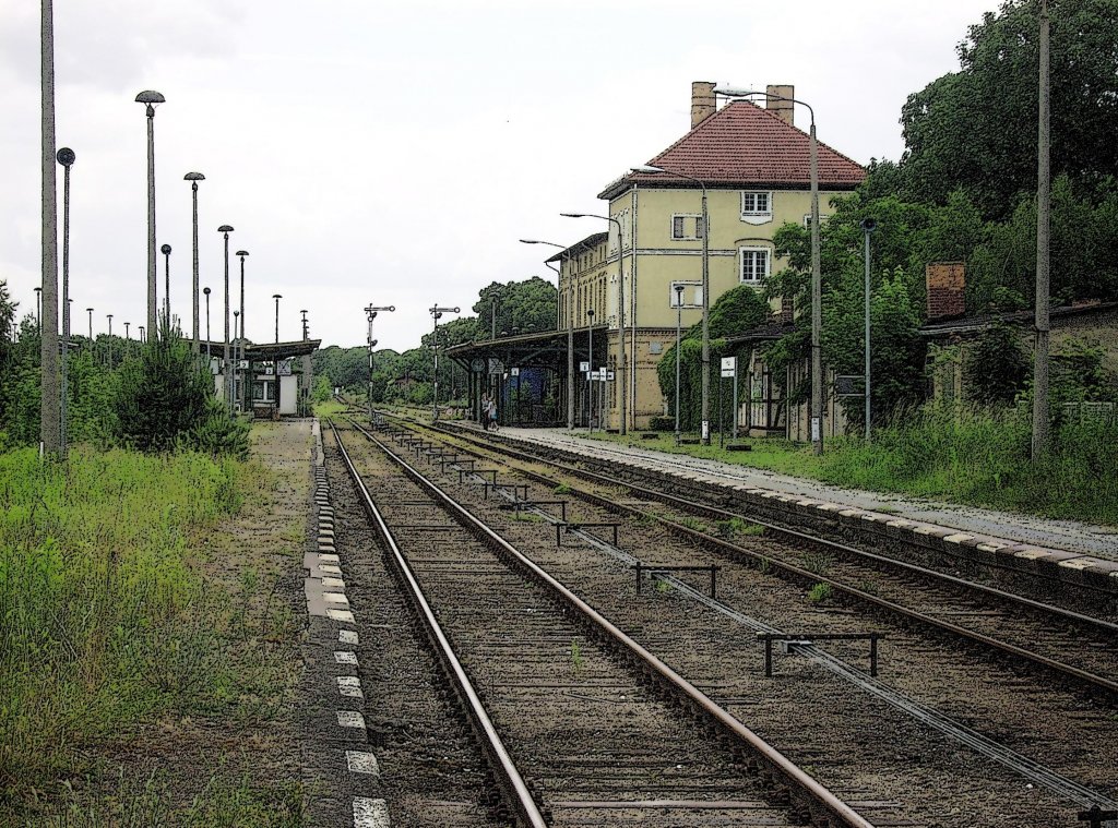 Die letzten zwei Bahnsteiggleise des Bahnhofs Templin im Sommer 2009, mit Blick in Richtung Löwenberg (Mark). Das Bild wurde mit Paint.NET bearbeitet.