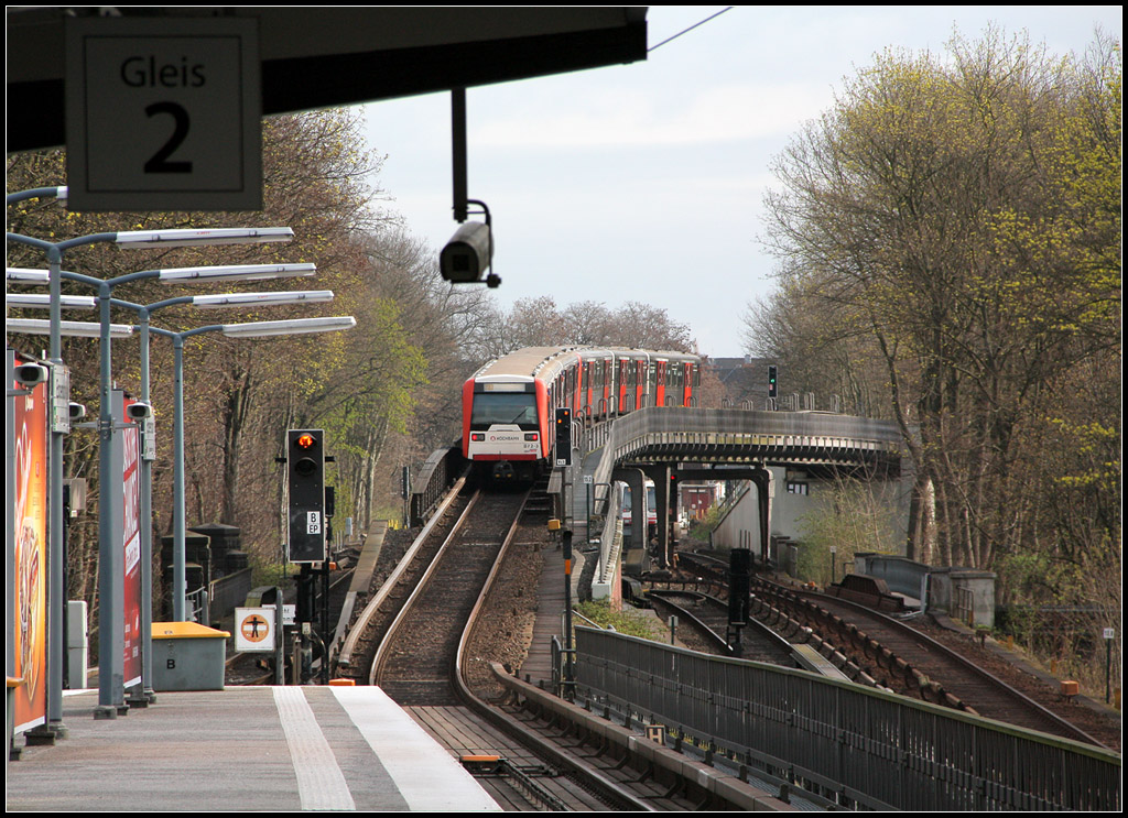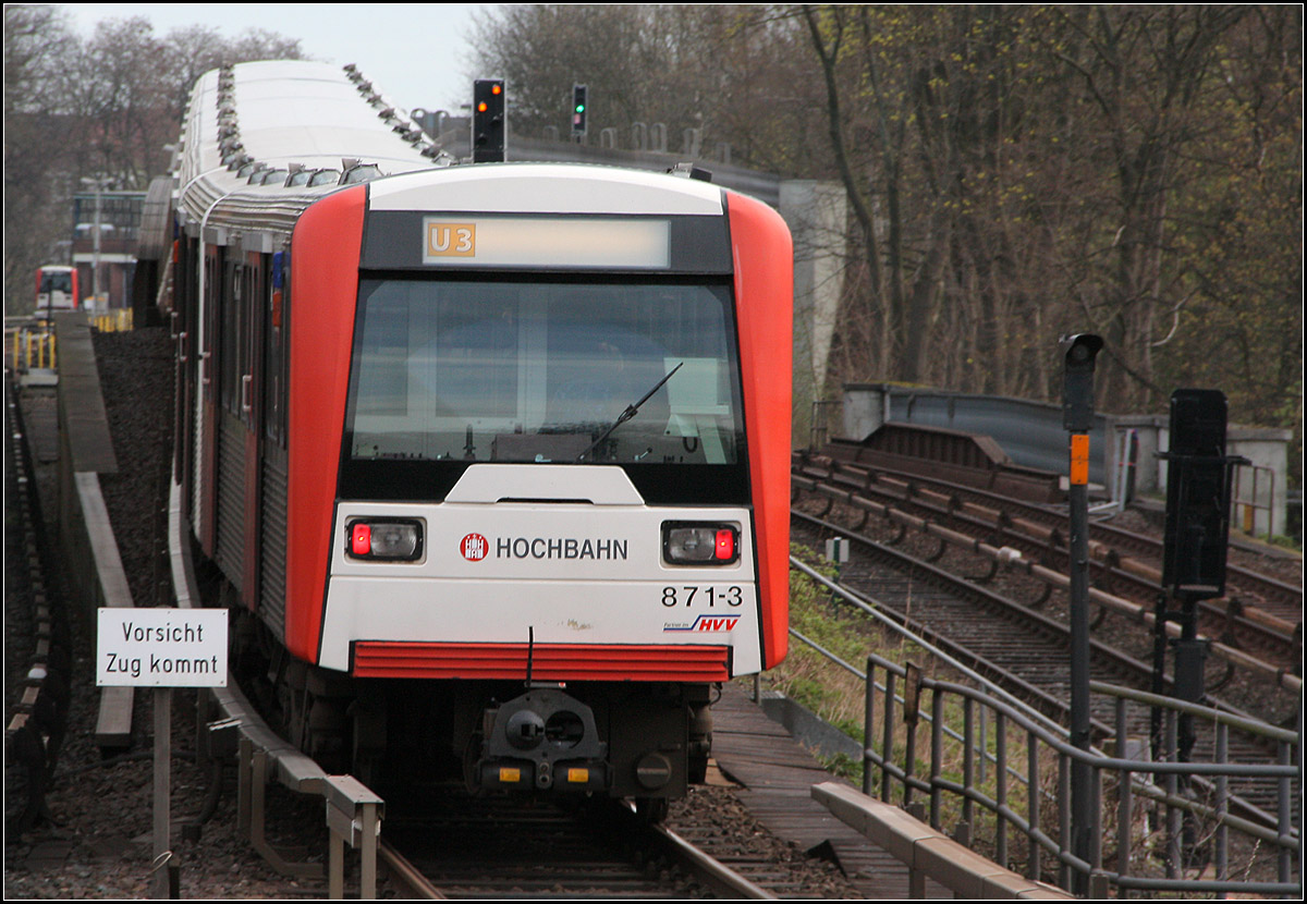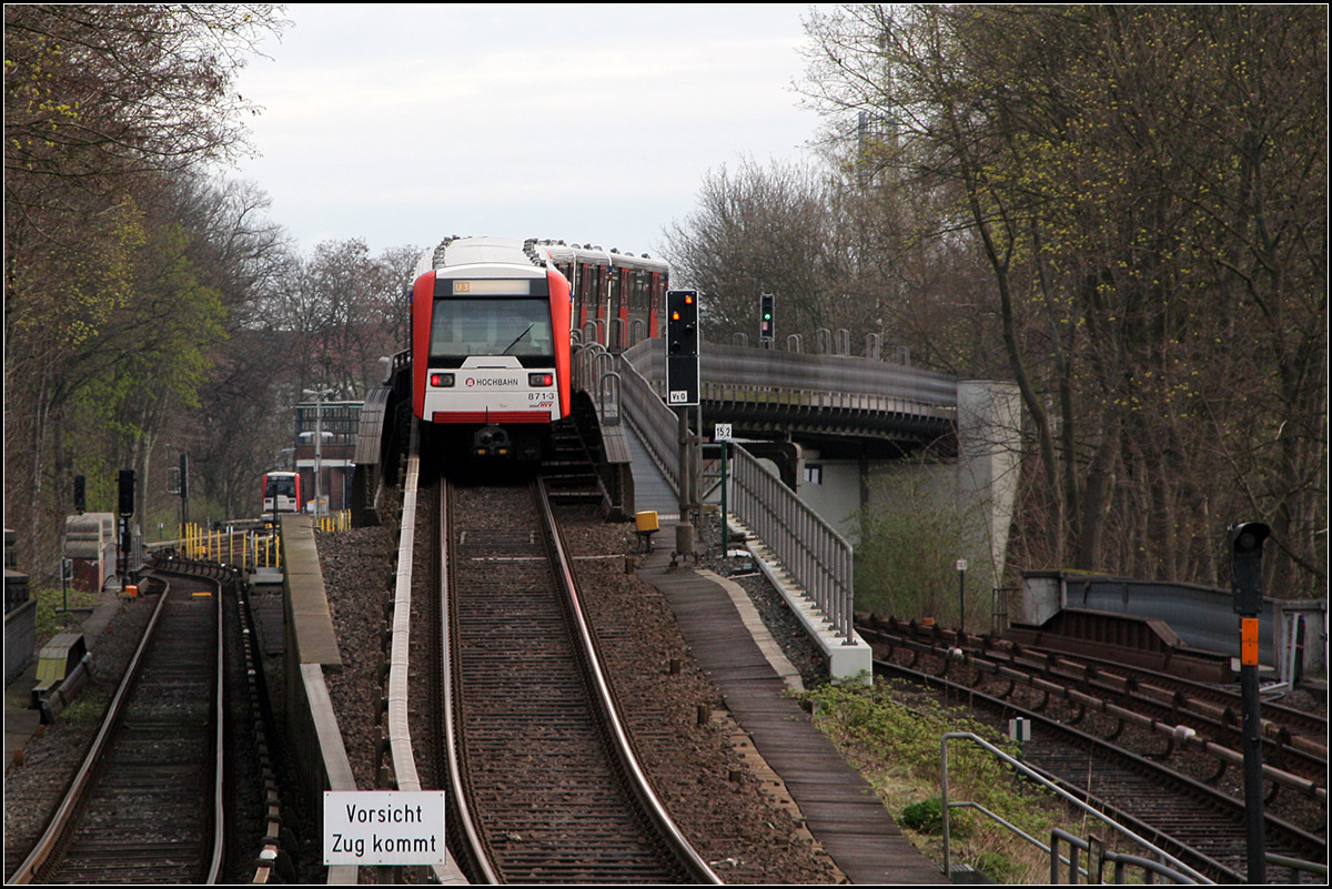 . Jetzt gehts hoch - Ein Zug der Hamburger U3 am Beginn der kurzen Steigungstrecke auf das Überwerfungsbauwerk nördlich der Station Eppendorfer Baum. Der Zug kommt allerdings nicht, er geht. 11.04.2012 (M)