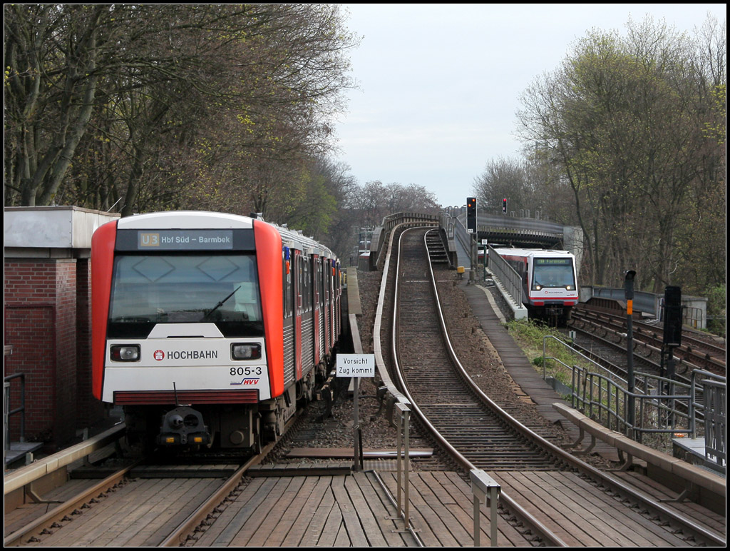 Vorsicht Zug kommt! - Parallelfahrt eines DT3-Zuges auf der U3 und eines DT4-Zuges auf der U1 kurz vor der Haltestelle Eppendorfer Baum. Nur die Bahn der U3 wird hier anhalten, die U1 wird dagegen gleich in einen Tunnel verschwinden. 11.04.2012 (M)