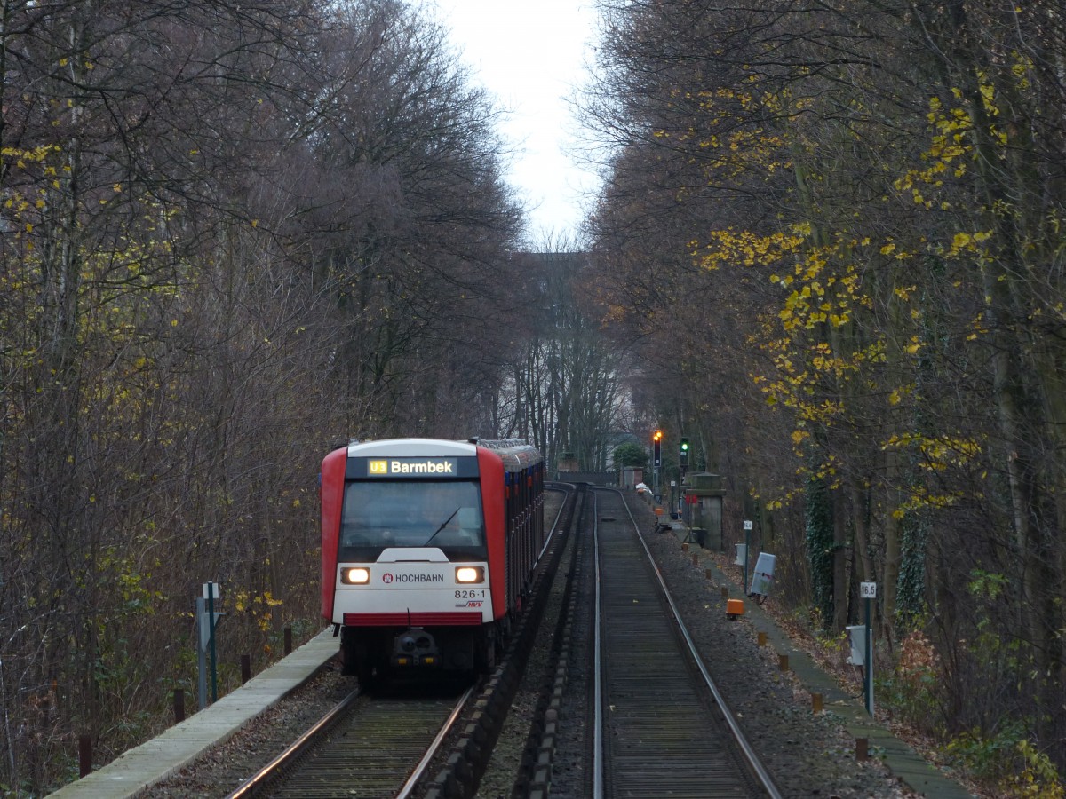 Auf der U3 nach Barmbek sind verschiedene Baureihen im Einsatz. Hier ein DT3 (826-1). Hoheluftbrücke Hamburg, 6.12.2015