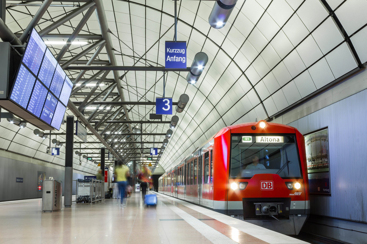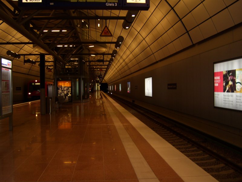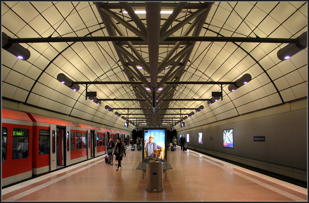 S-Bahnstation Hamburg Flughafen (Airport), eröffnet am 12.12.2008. Blick vom Zwischengeschoß in die Halle. 29.08.2011