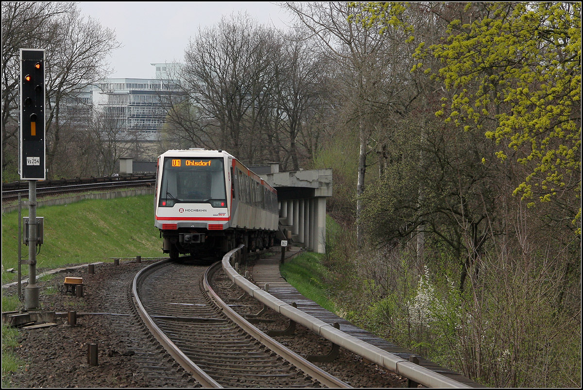 . Abzweig - Ursprünglich war die Hochbahnstrecke nach Großhansdorf und Ohlstedt in Barmbek an den Ring angeschlossen. In den fünziger und sechziger Jahre wurde vom Jungfernstieg über Messberg, Hauptbahnhof und Wandsbek eine weitgehend im Tunnel verlaufende Neubaustrecke gebaut. An der Station Wandsbek-Gartenstadt (Bild) schließt diese Strecke an die bestehende Strecke an. So wurde aus der Innenstadt eine direktere Verbindung zu dieser langen Außenstrecke geschaffen und die U1 wird seither über die neue Strecke geführt. Die Strecke von Barmbek her endet jetzt in der viergleisigen Haltstelle Wandsbek-Gartenstadt. Das Bild zeigt einen Zug der U1, der die Station verlassen hat und auf den Weg zur Tunnelstrecke noch die beiden älteren Gleise der U3 unterfahren muss. 12.04.2013 (M)