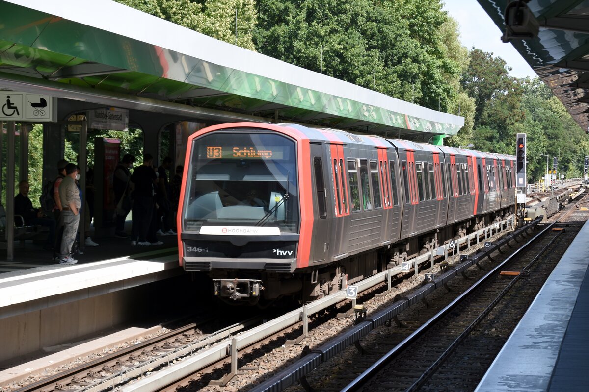 HAMBURG, 01.08.2022, U 3 nach Schlump bei der Einfahrt in den U-Bahnhof Wandsbek-Gartenstadt (Linien U1 und U 3)