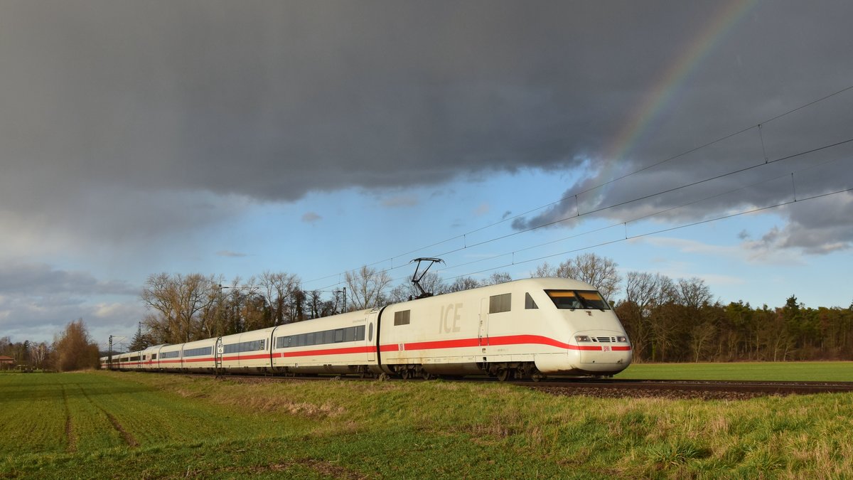 Ein ICE 1 auf dem Weg nach Norden präsentiert sich auf der Riedbahn zwischen Riedstadt Wolfskehlen und Groß-Gerau Dornberg mit einem Regenbogen im Hintergrund. Aufgenommen am 1.11.2018 16:54 Br111 Fan
