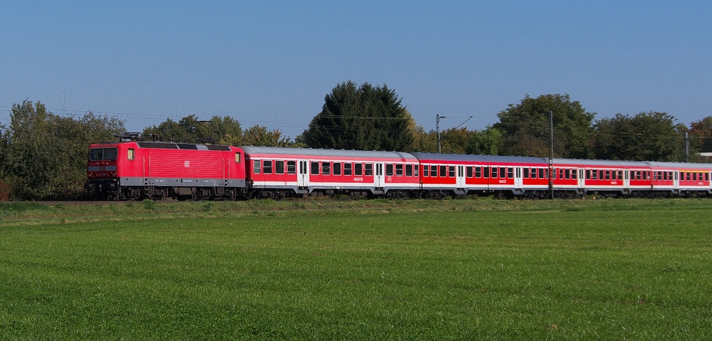 An diesem recht warmen Oktobertag schiebt 143 133-7 ihre Regionalbahn auf der Bahnstrecke zwischen Frankfurt und Hanau. Zwischen Maintal West und Hanau Wilhelmsbad geht es wie an der Schnur gezogen geradeaus.