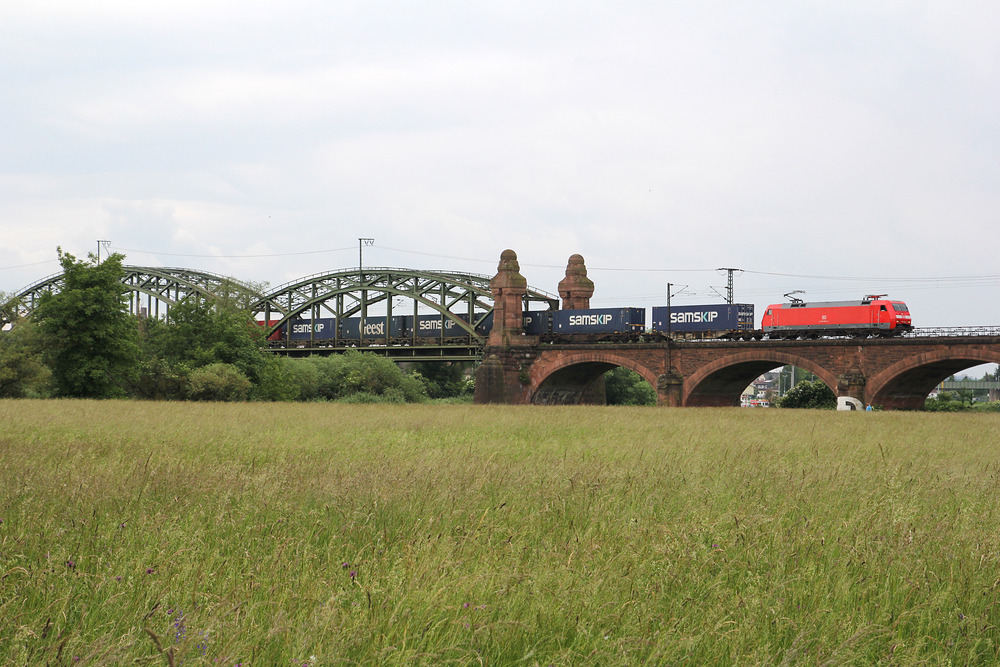 Sonnenaufgang an der Mainbrücke zwischen Kostheim und Bischofsheim. Während die Wiese noch von Reif überzogen ist und im Hintergrund die ersten Flugzeuge vom Frankfurter Flughafen starten, passieren zwei Traxx-Lokomotiven mit einem Güterzug das Bauwerk. (15.02.2017) Sebastian B.