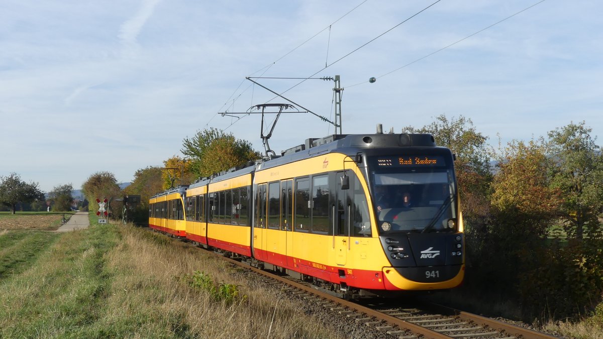 Am 3. November 2018 fanden auf der RB11 Frankfurt Höchst - Bad Soden Vorführungsfahrten mit einem AVG-Stadtbahntriebwagen statt. Damit sollte für das Projekt "Regionaltangente West", eine geplante Stadtbahnstrecke westlich von Frankfurt, geworben werden. Die beiden Triebwagen sind hier auf der Fahrt als RB11 nach Frankfurt Höchst zwischen Sulzbach und Sossenheim mit dem Taunus im Hintergrund zu sehen. Aufgenommen am 3.11.2018 15:49 Br111 Fan