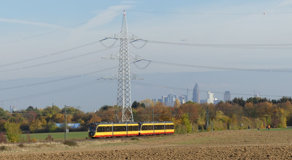 Am 3. November 2018 fanden auf der RB11 Frankfurt Höchst - Bad Soden Vorführungsfahrten mit einem AVG-Stadtbahntriebwagen statt. Damit sollte für das Projekt "Regionaltangente West", eine geplante Stadtbahnstrecke westlich von Frankfurt, geworben werden. Hier präsentieren sich die beiden Triebwagen auf dem Weg nach Bad Soden zwischen Frankfurt Sossenheim und Sulzbach (Taunus) vor den Türmen der Frankfurter Skyline. Aufgenommen am 3.11.2018 15:05 Br111 Fan
