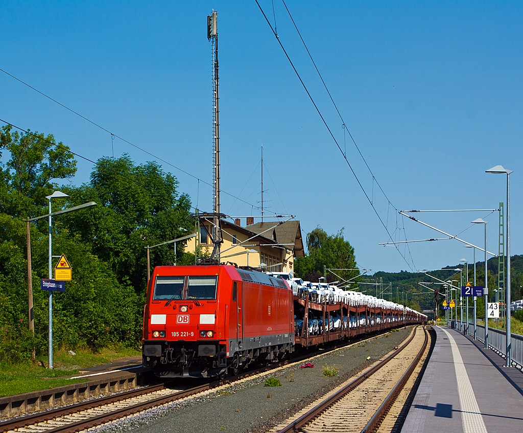 185 221-9 der DB Schenker Rail (eine Bombardier TRAXX F140 AC2) zieht am 07.07.2013 einen sehr langen Autozug (mit Neuwagen der Marke mit den vier Ringen) durch den Bahnhof Ehringshausen (Kr. Wetzlar).