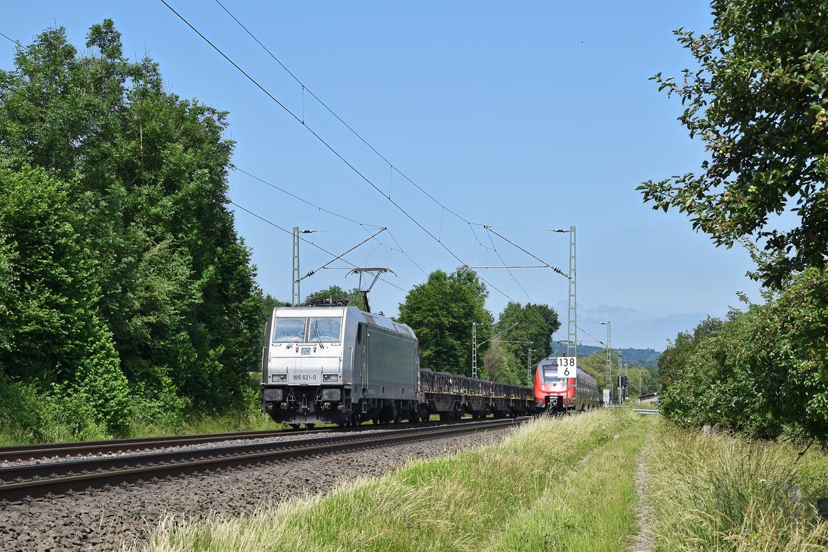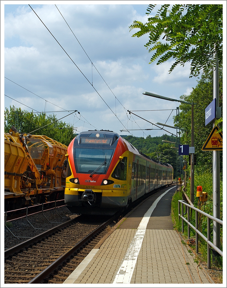 Der 5-teilige Flirt 429 046 / 429 546 der HLB (Hessischen Landesbahn) durchfährt als RE 99 Main-Sieg-Express (Siegen-Gießen-Frankfurt am Main) am 13.07.2013 den Haltepunkt Katzenfurt (Lahn-Dill-Kreis) an der KBS 445 (Dillstrecke). Armin Schwarz