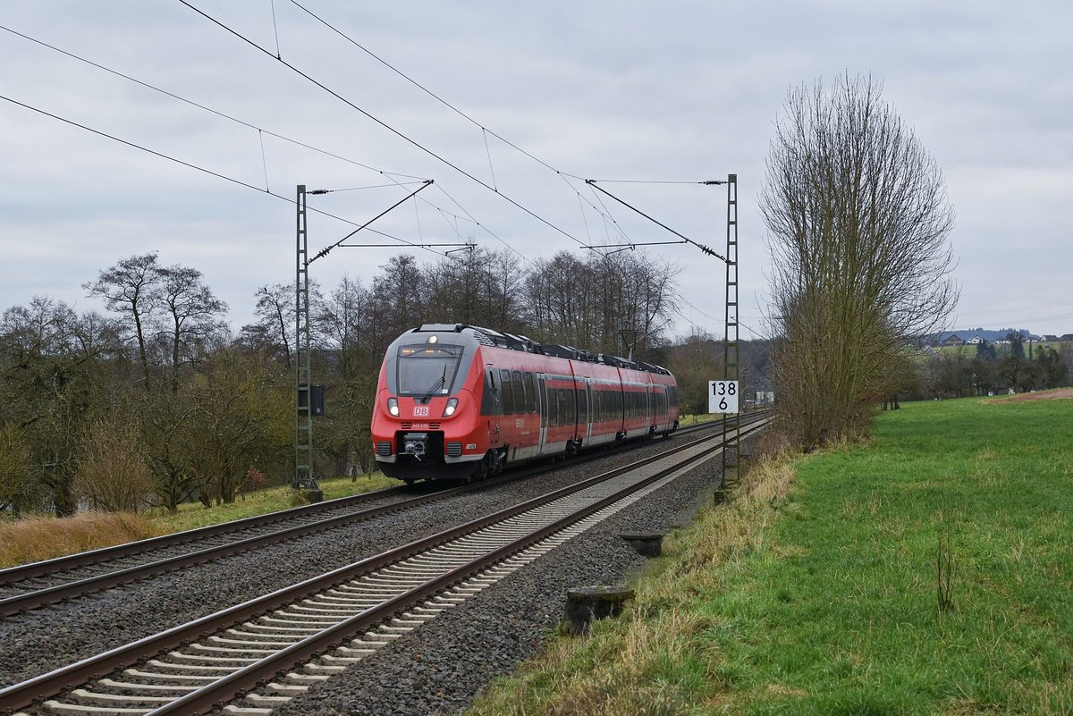 DB Regio 442 289/789 ist als RB 40 (15111) "Mittelhessen-Express" Dillenburg - Frankfurt (Main) Hbf am 06.12.17 bei Katzenfurt unterwegs. Reinhard Kühn