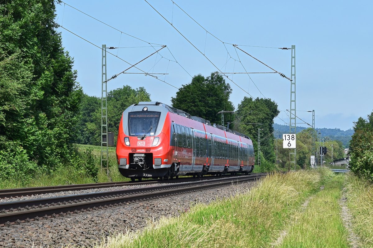 Der dreiteilige Bombardier Talent 2 (442 610 / 442 110) der DB Regio als SE 40 Mittelhessen-Express (Frankfurt Hbf – Friedberg – Butzbach – Gießen – Wetzlar – Herborn – Dillenburg) fährt am 22.07.2013 in Haltepunkt Katzenfurt ein.