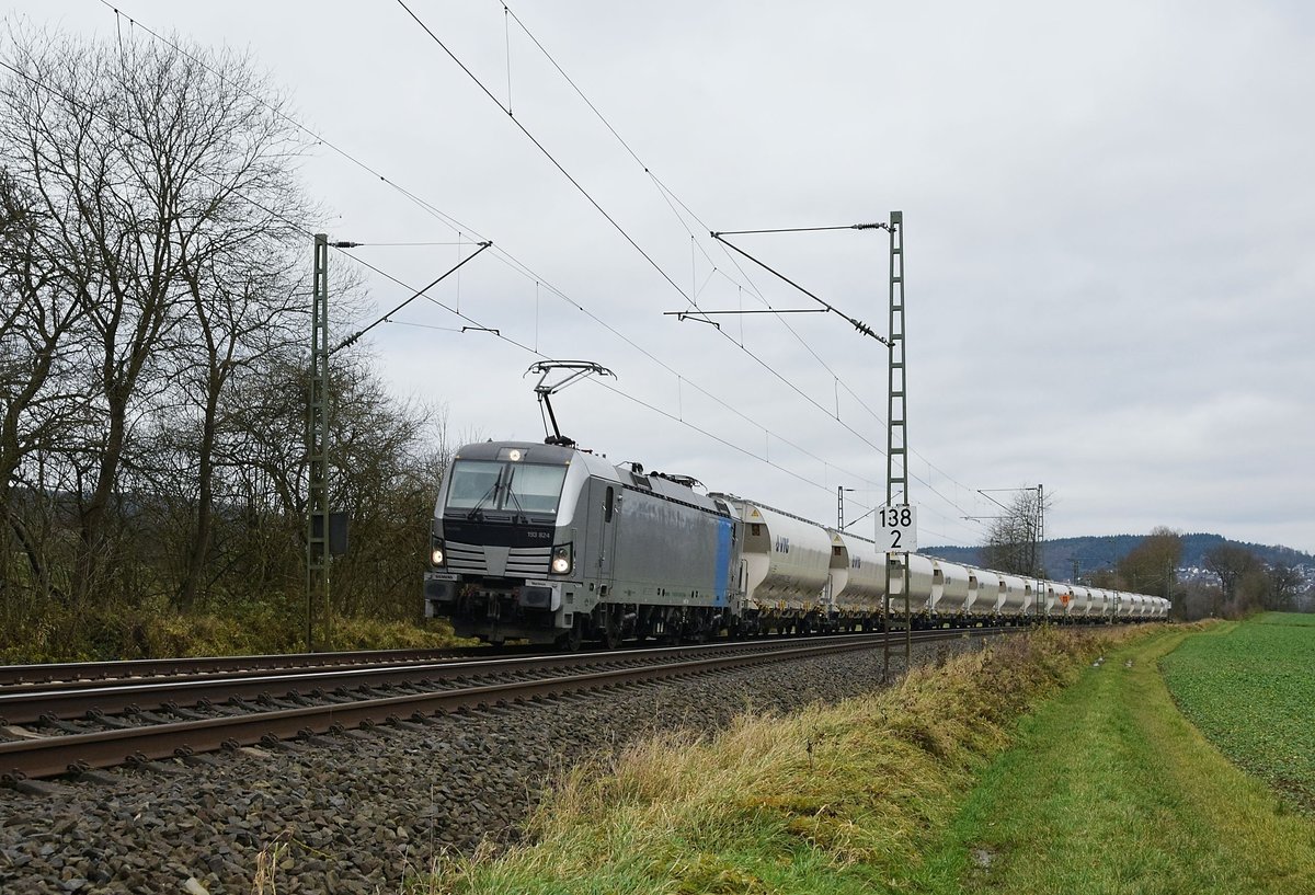 Die an RTB Cargo vermietete Railpool 193 824 befindet sich mit einem Getreidewagenzug am 06.12.17 bei Katzenfurt auf der Fahrt in Richtung Gießen. Reinhard Kühn