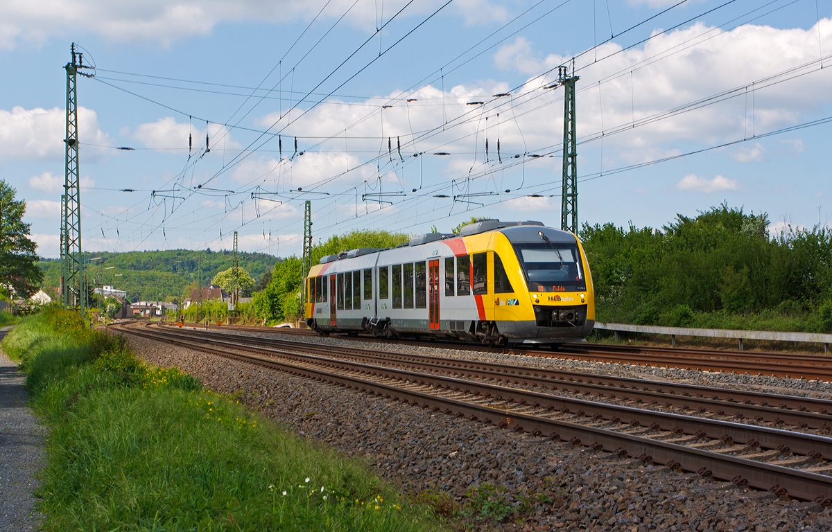 Der VT 286 (95 80 0648 026-2 D-HEB / 95 80 0648 526-1 D-HEB)  der HLB (Hessischen Landesbahn) ein LINT 41 fährt am 03.05.2014 bei Dutenhofen in Richtung Gießen. Er fährt als RB die Verbindung Limburg/Lahn - Wetzlar - Gießen - Fulda.