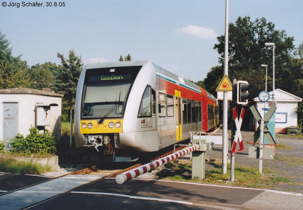 Der HLB-Triebwagen 508 114 fährt am 30.8.05 in Watzenborn-Steinberg nach Gießen ab. Hinten rechts sieht man die Wartehalle.
