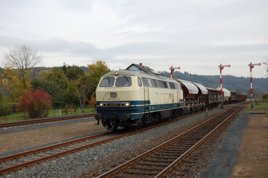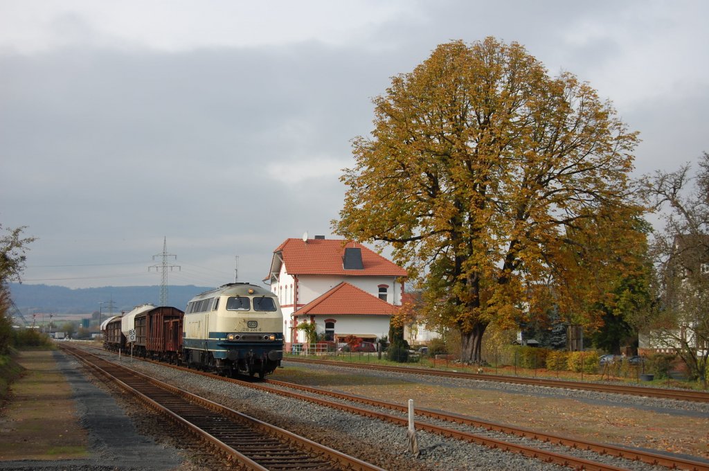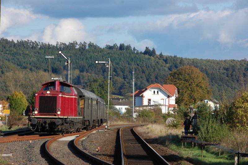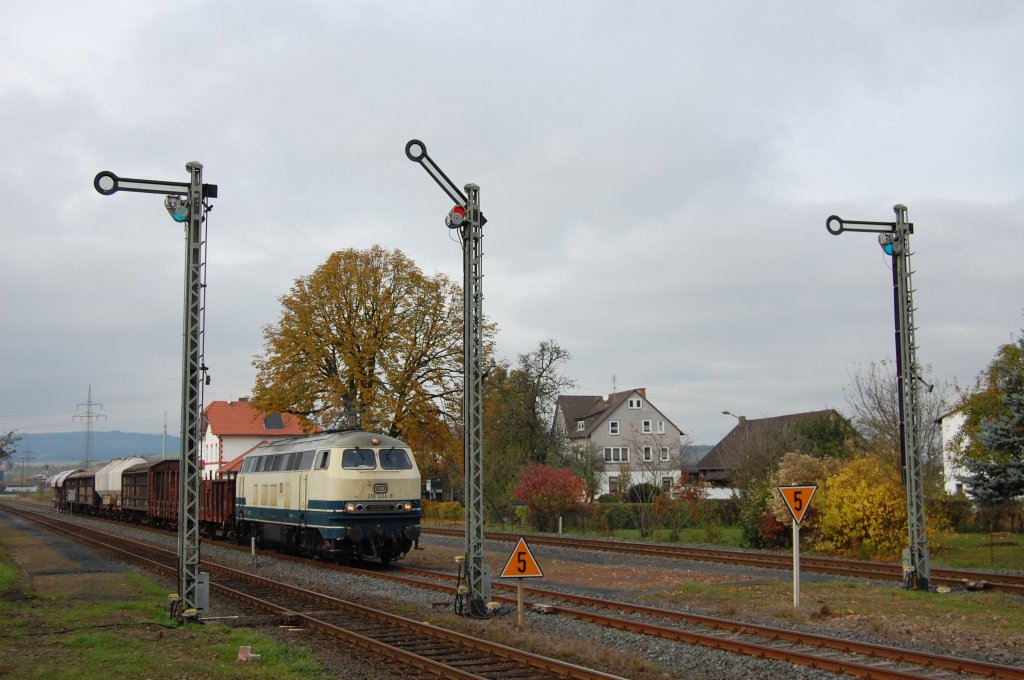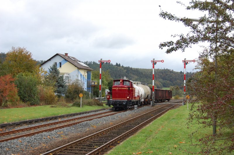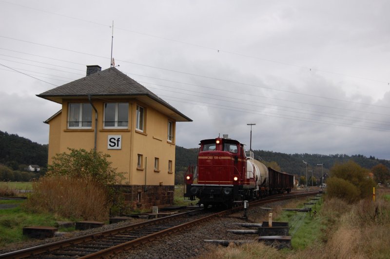 260 109 mit Fotogüterzug am 17.10.2009 bei der Einfahrt in Sarnau. Sarnau hat als Besonderheit nur Signale die Hp0 und Hp1 zeigen können. Leider war hier der Güterzug 5 Minuten vor Plan unterwegs, sodass ich nicht mehr den Idealen Fotostandpunkt erreichen konnte, da ich überascht wurde. Tobias Schuminetz, Hirschau