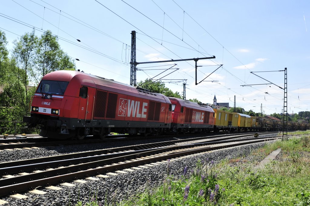 ER20 bzw. BR223 der WLE, hier die Loks 22 und 23 im Doppelpack vor einem schweren Bauzug. Das Bild entstand am Vormittag des 02. Juni in der nördlichen Bahnhofsausfahrt des Bahnhofs Hünfeld. Dirk Jonas