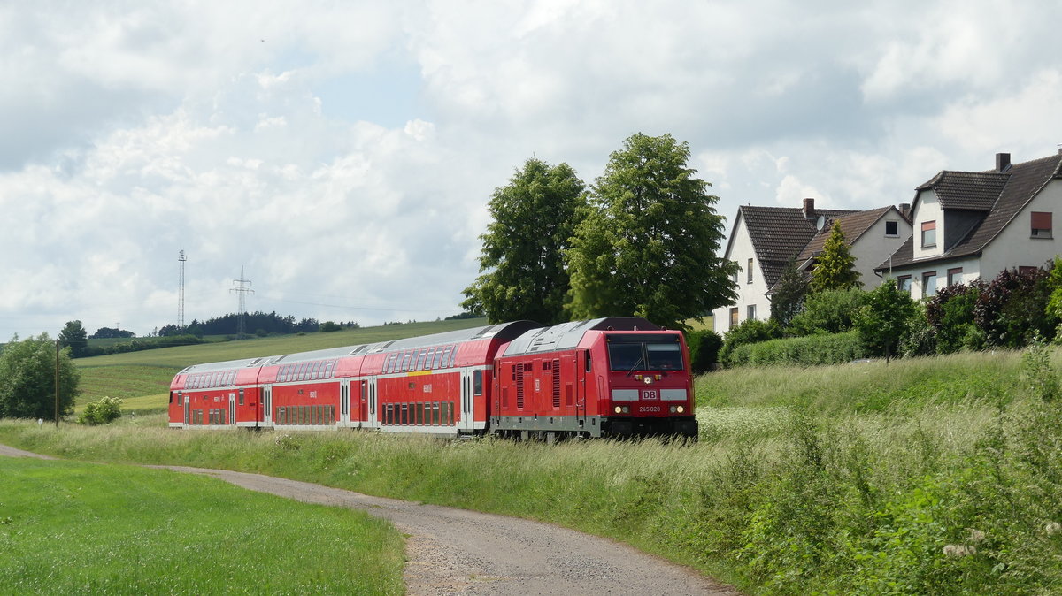 Anlässlich des Hessentags 2018 zieht 218 460 eine Verstärkergarnitur mit n-Wagen als RB4 von Kassel nach Korbach, hier kurz hinter Twiste. Aufgenommen am 1.6.2018 15:48 Br111 Fan