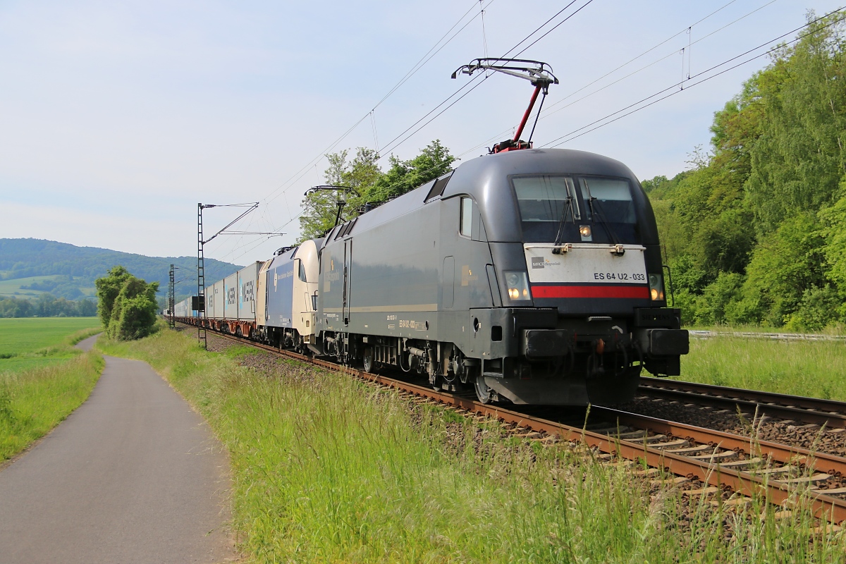 182 524 (ES 64 U2-024) der WLC mit 182 533 (ES 64 U2-033) als Vorspann-Lok und Containerzug in Fahrtrichtung Norden. Aufgenommen zwischen Wehretal-Reichensachsen und Eschwege West am 21.05.2014. Jens Baumhauer