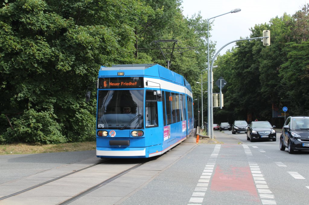 An der Haltstelle Dr. Lorenz-Weg in Rostock durchfährt Wagen 682 der Rostocker Straßenbahn mit der Linie 6 den Tiergarten am 28. August 2018.
