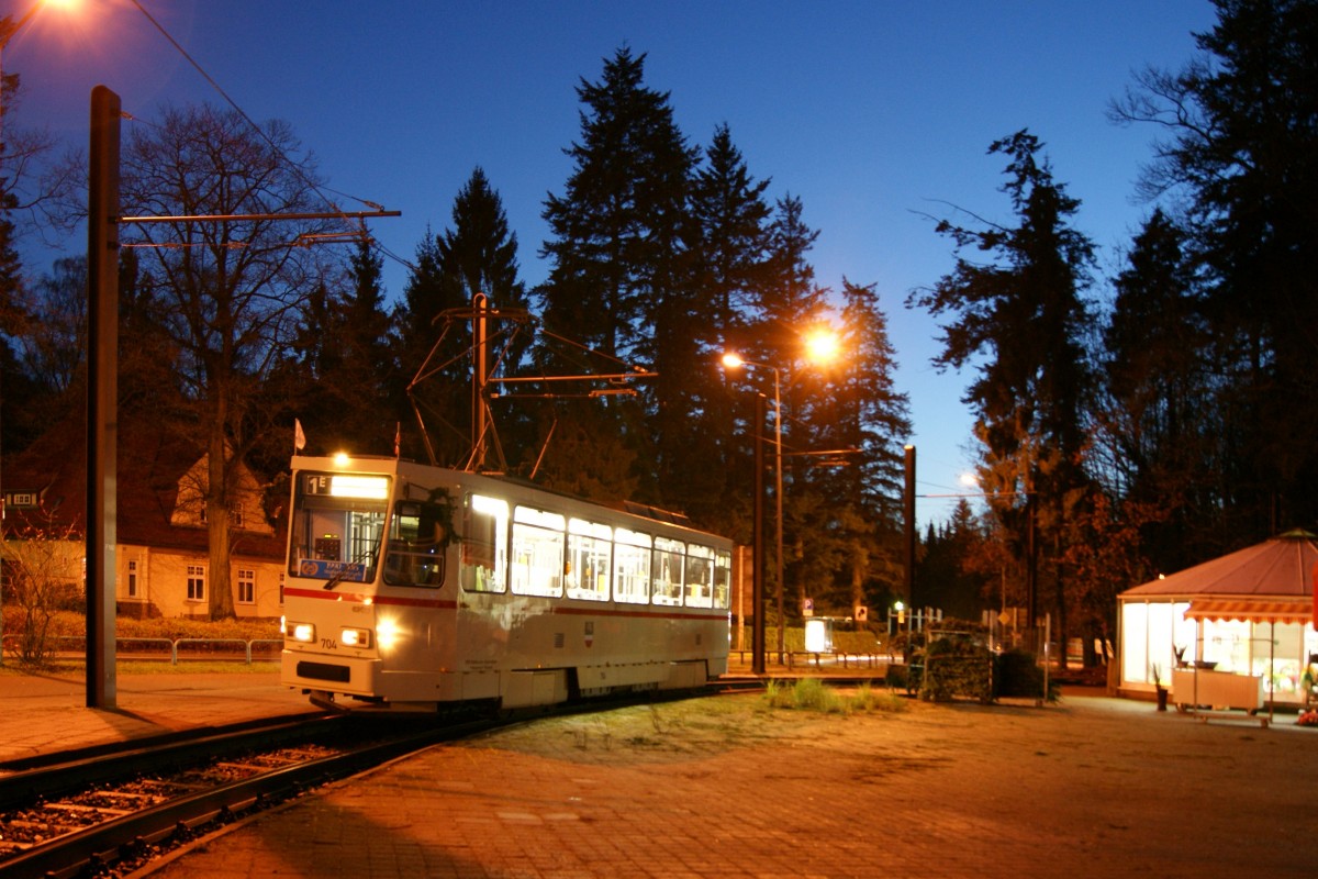 Am 28.11.2015 war der Rostocker T6A2 704 anlässlich des 25-Jährigen Geburtstages der Strecke nach Toitenwinkel im Linienverkehr unterwegs. Sein Fahrplan führte ihn Abends zum Neuen Friedhof. Michael Brunsch