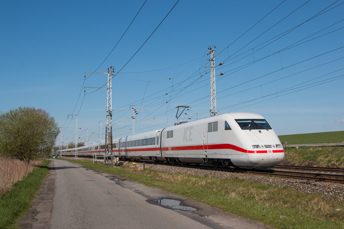 401 508/008 als umgeleiteter ICE 2500 von Stralsund nach Berlin Südkreuz am Abzweig Riekdahl in Rostock. Der Zug hielt nicht in Rostock, nächster Halt war Neustrelitz. Grüße zurück an den freundlichen Tf. Fotografiert am 23.04.2023. Christian Geschonneck