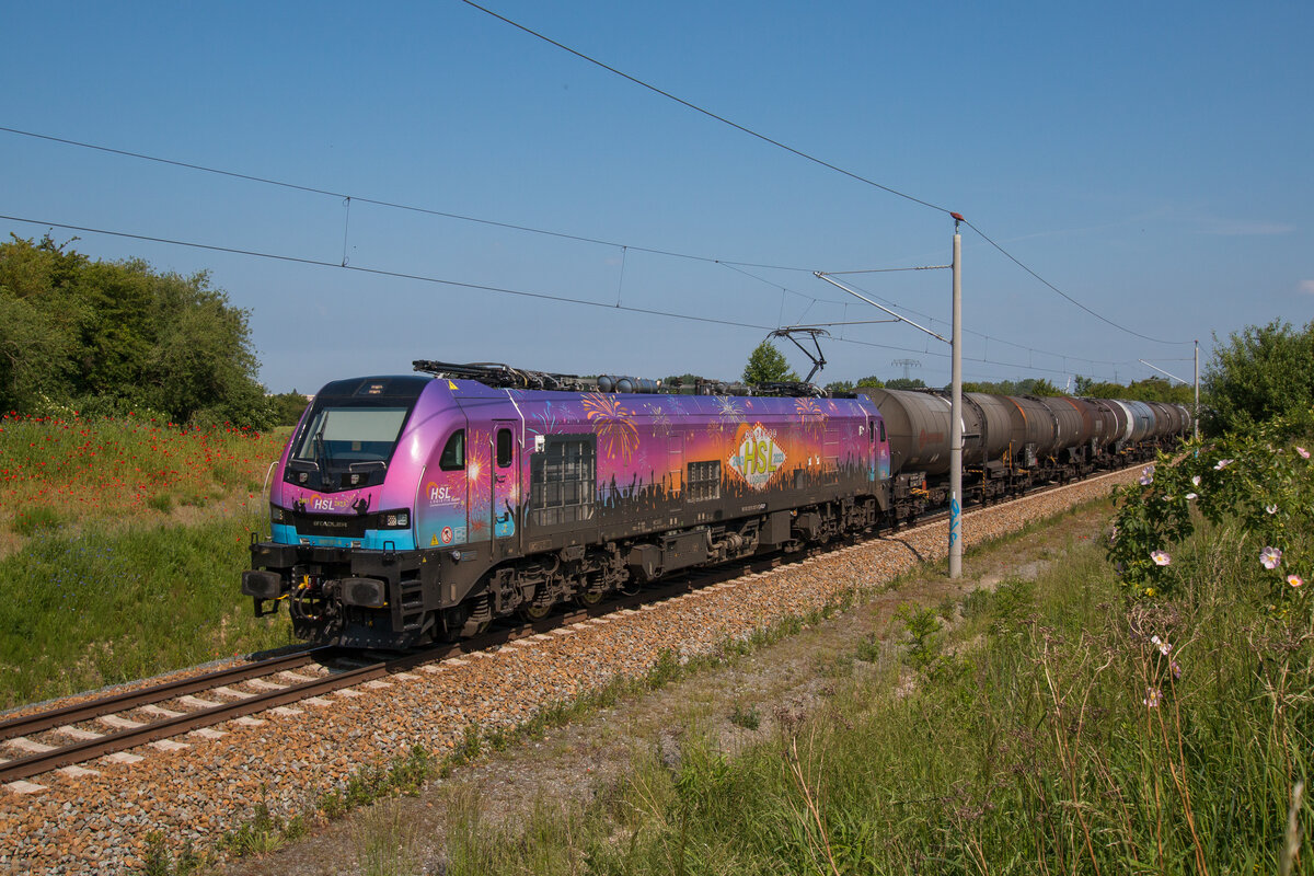 Was für ein Schlachtschiff. Mit 6 Achsen, 23 Meter Länge und knapp über 120 Tonnen Gewicht fährt 2019 307-8 durchs Land. Mit dem bunten Feuerwerksdesign feiert HSL Logistik das 20-jährige Bestehen. Fotografiert am 26.05.2024 in Rostock Riekdahl. Christian Geschonneck