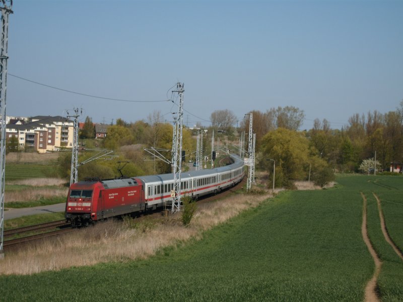 BR 101 045 zieht den InterCity 2213 Binz-Stuttgart in Höhe Riekdahl. Gleich wird sie Rostock Hbf erreichen und bis Hamburg Hbf schieben.