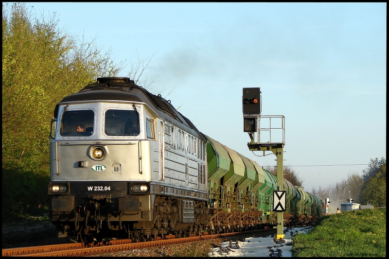 ITL W 232.04 am Abend des 27.04.2007 bei Schotterarbeiten auf der Strecke Velgast-Barth, hier in Höhe der Ortschaft Manschenhagen.