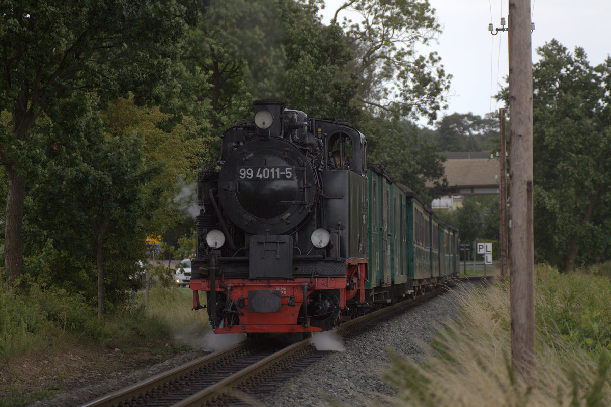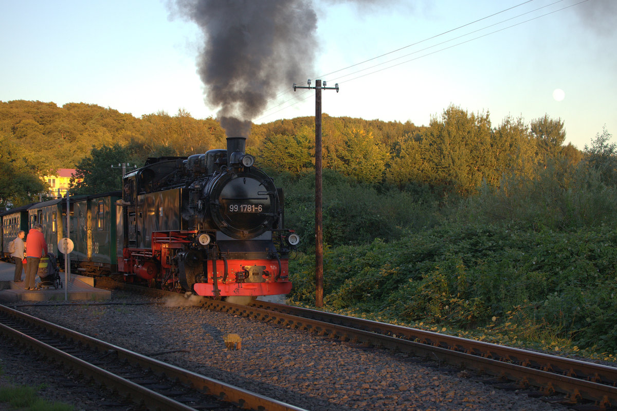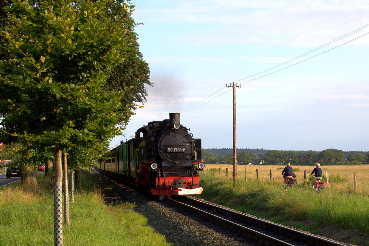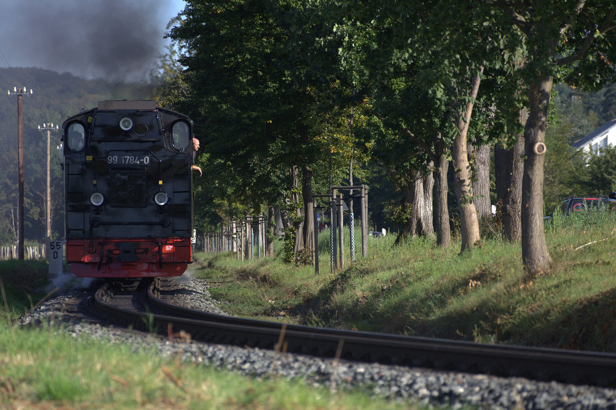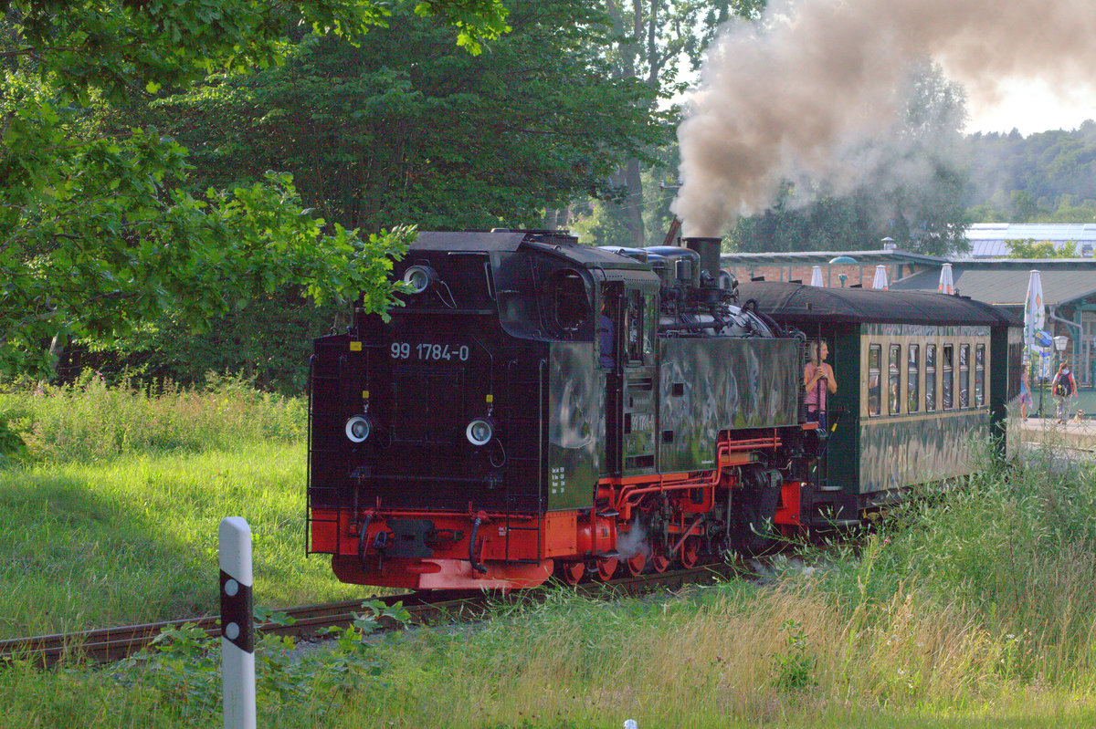 "Ich mach zu" hat der Meester sicher schon seinem Heizer zugerufen,denn nach der Baber Gegenkurve rollt der Zug von alleine nach Sellin. 99 1784-0 mit dem Frühzug nach Binz. 30.07.2017 09:02 Uhr. Siegfried Heße