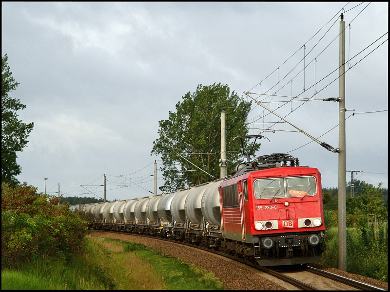 155 230-6 legt sich mit dem umgeleiteten DGS 59193 von Rostock-Seehafen nach Rüdersdorf am 18.09.2010 elegant in die Kummerower Kurve. Jens-Peter Schlör