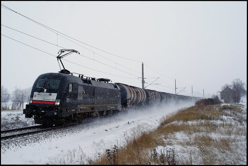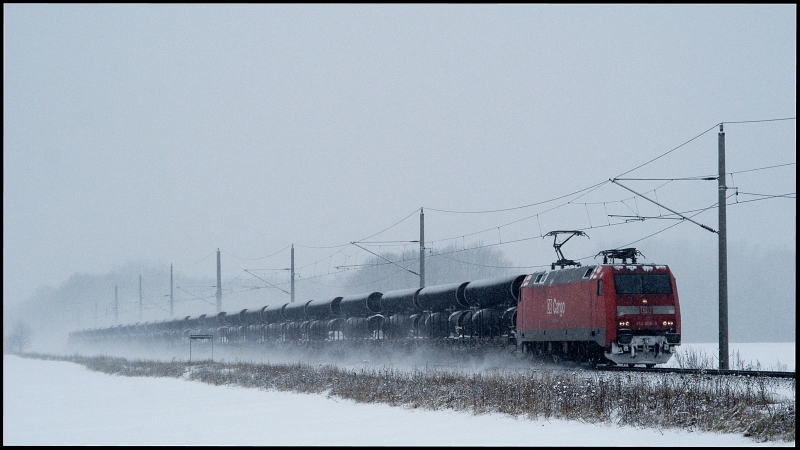 Nach einem kleinen Ackermarsch konnte 152 008-9 mit einem Röhrenzug von Mülheim-Styrum nach Sassnitz-Mukran am 17.12.2010 in der Nähe von Kummerow abgelichtet werden. Der Tf hatte ein Herz für den einsamen Ackersteher und machte dies auch deutlich. Jens-Peter Schlör