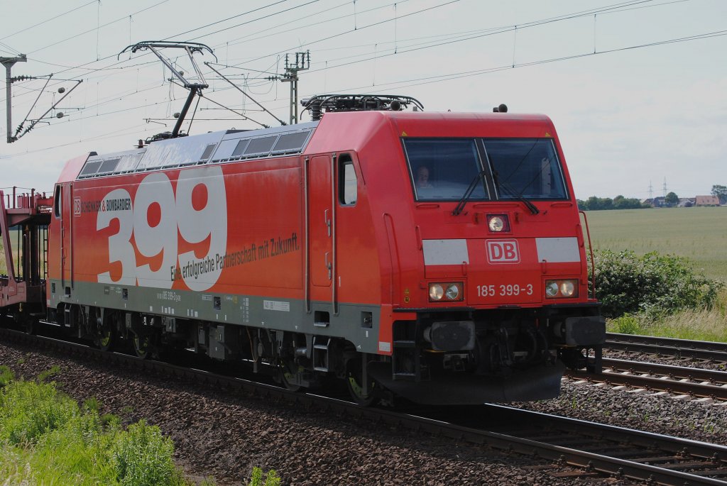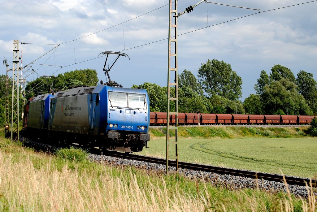 185 530-3 VPS und 185 CL-008 kommen mit ihrem Erzzug aus dem Bahnhof Salzgitter Beddingen um auf die Strecke Richtung Hannover zu fahren am 18.06.2011. Mein 500. Bild bei Bahnbilder Edmund Schulz