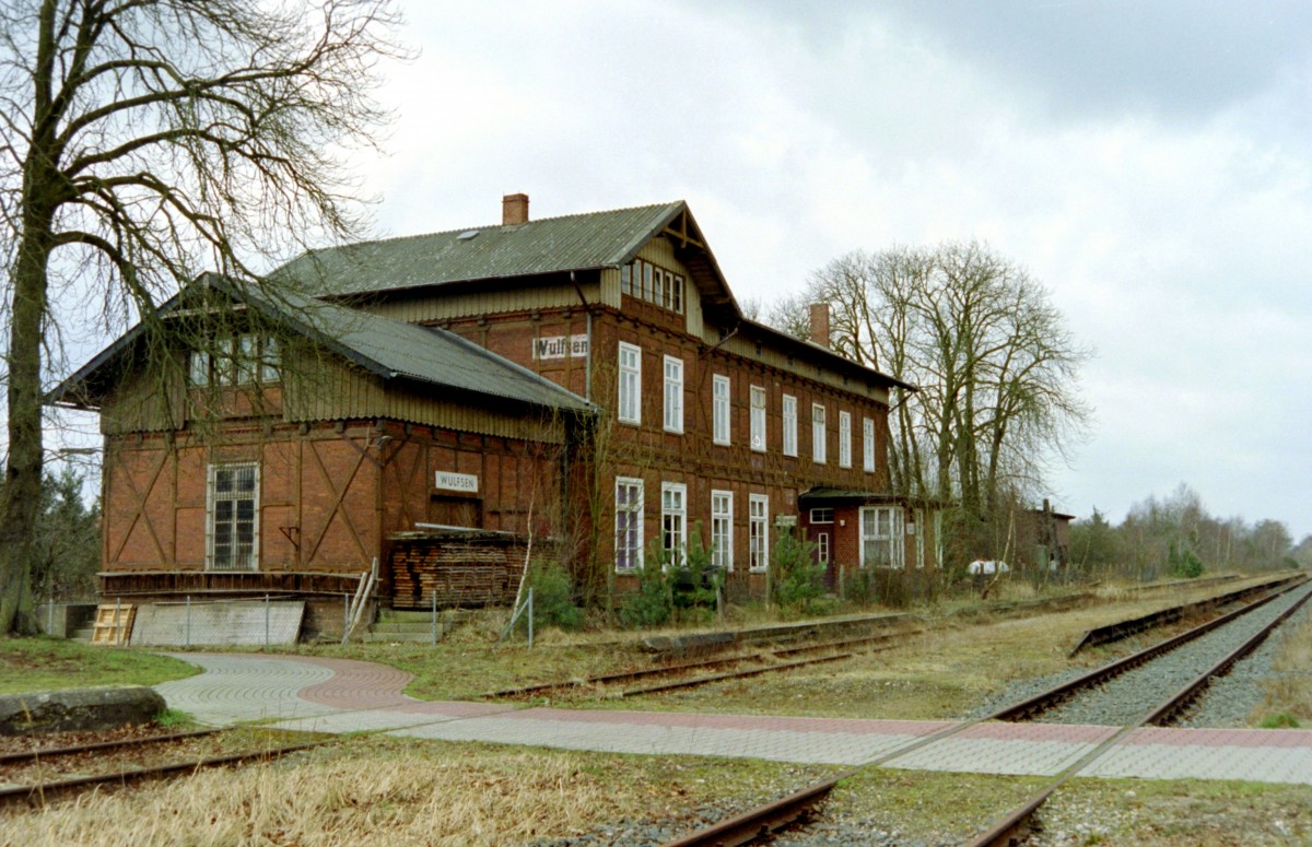 Der Bahnhof Wulfsen an der Strecke Lüneburg–Buchholz (Nordheide) am 26.03.1995; der Personenverkehr endete am 26.09.1981, der Güterverkehr wurde am 01.05.1989 eingestellt. Gustav Richard