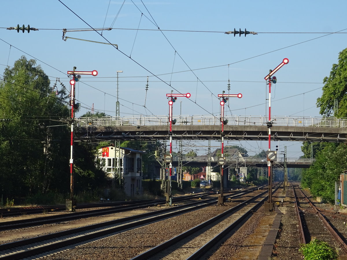 Historische Formsignale in Lingen (Ems). Links unter der Brücke erkennt man das dazugehörige, mechanische Stellwerk. Aufgenommen am 28.06.18 vom Bahnsteig 1 aus. Emslandbahner